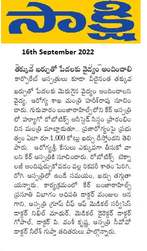 CARE Hospitals Advanced Robot Assisted Surgery Program Launch News Coverage in Sakshi